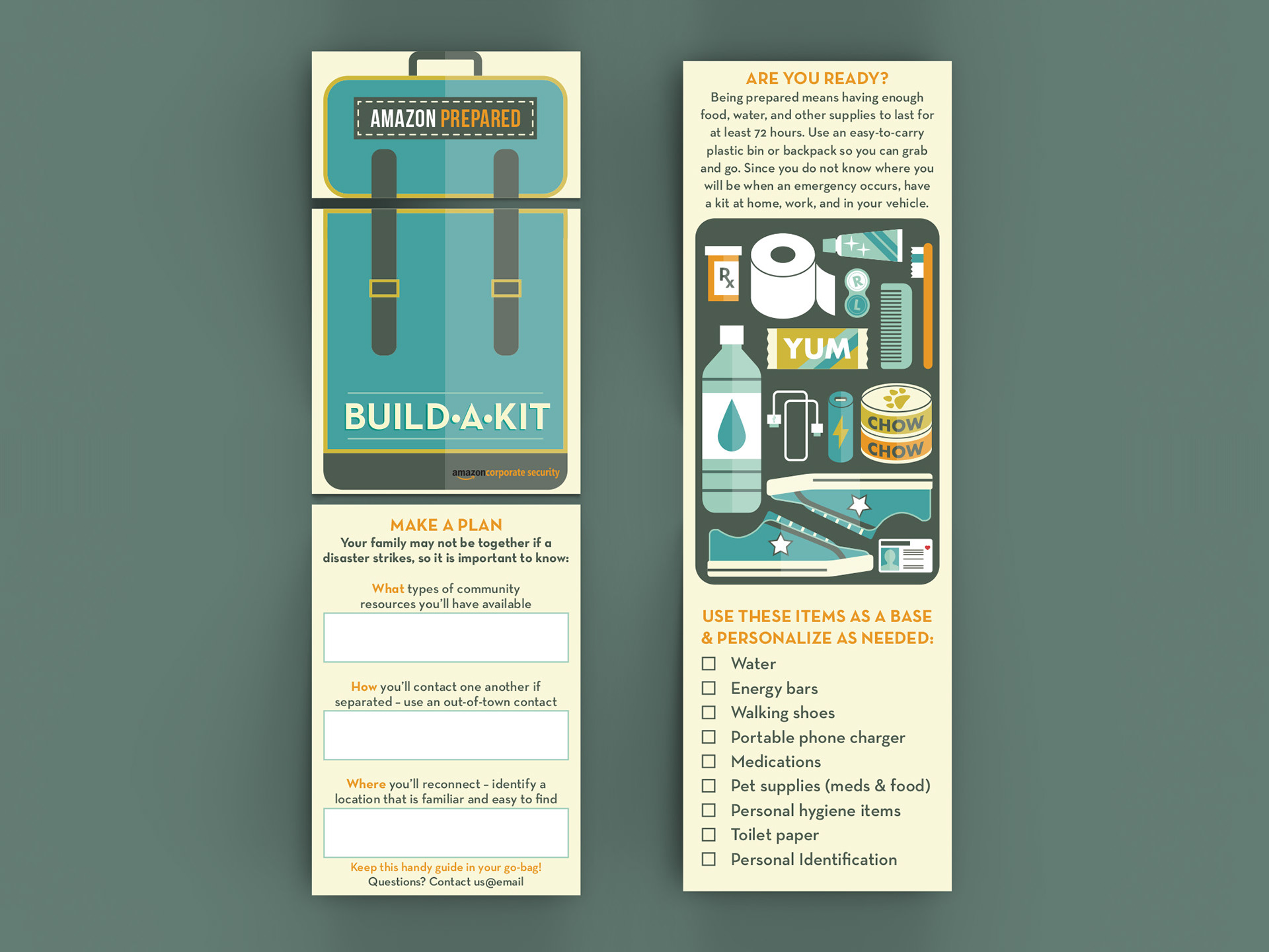 Amazon's Office Safety team needed an emergency preparedness reference that employees would actually keep accessible. I designed a compact tri-fold card that can be stashed in a wallet or bag. The design resembles a backpack that can be opened with infographic-style emergency items to pack in a go-bag. On the back, employees could fill out fields for contact information, particularly valuable if power or internet were unavailable during an emergency.