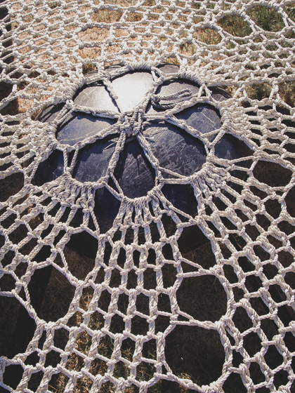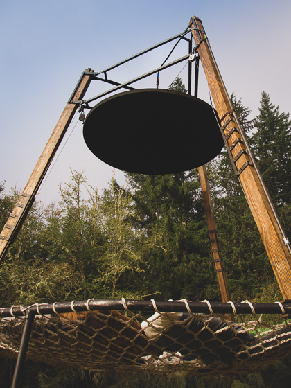 Hanging Garden is a fire art sculpture that inverts the usual campfire experience. A steel bowl of fire is suspended 10 feet above viewers as they lounge in a macrame net below.